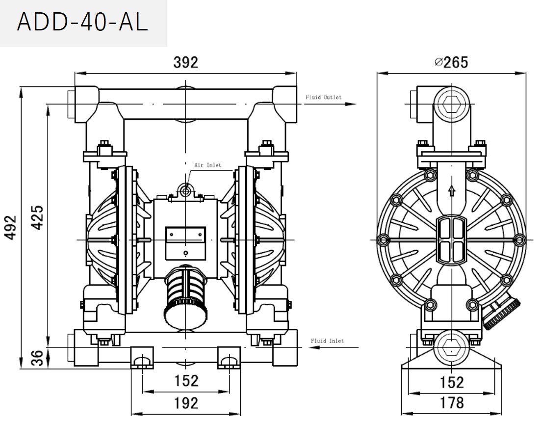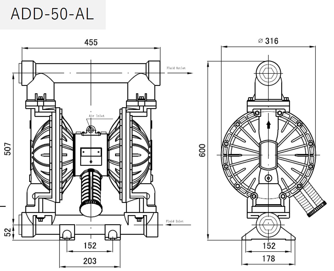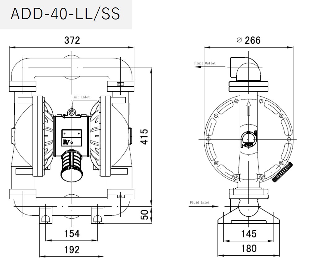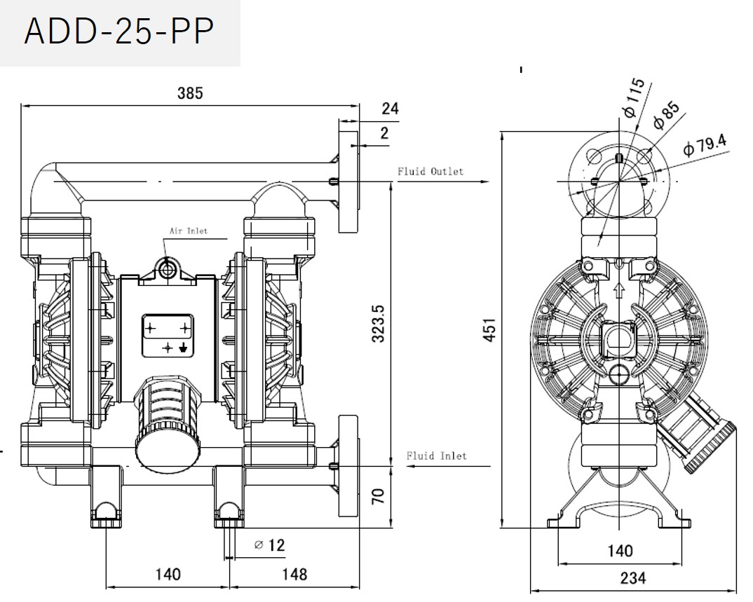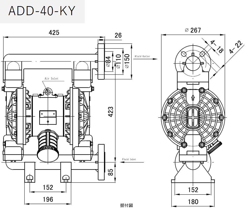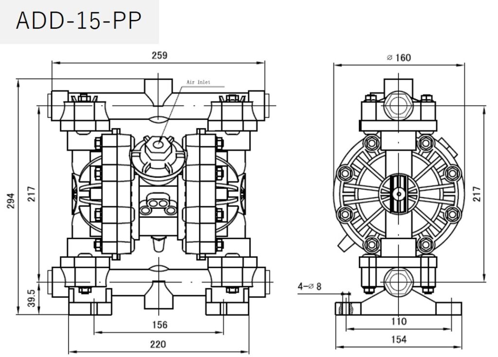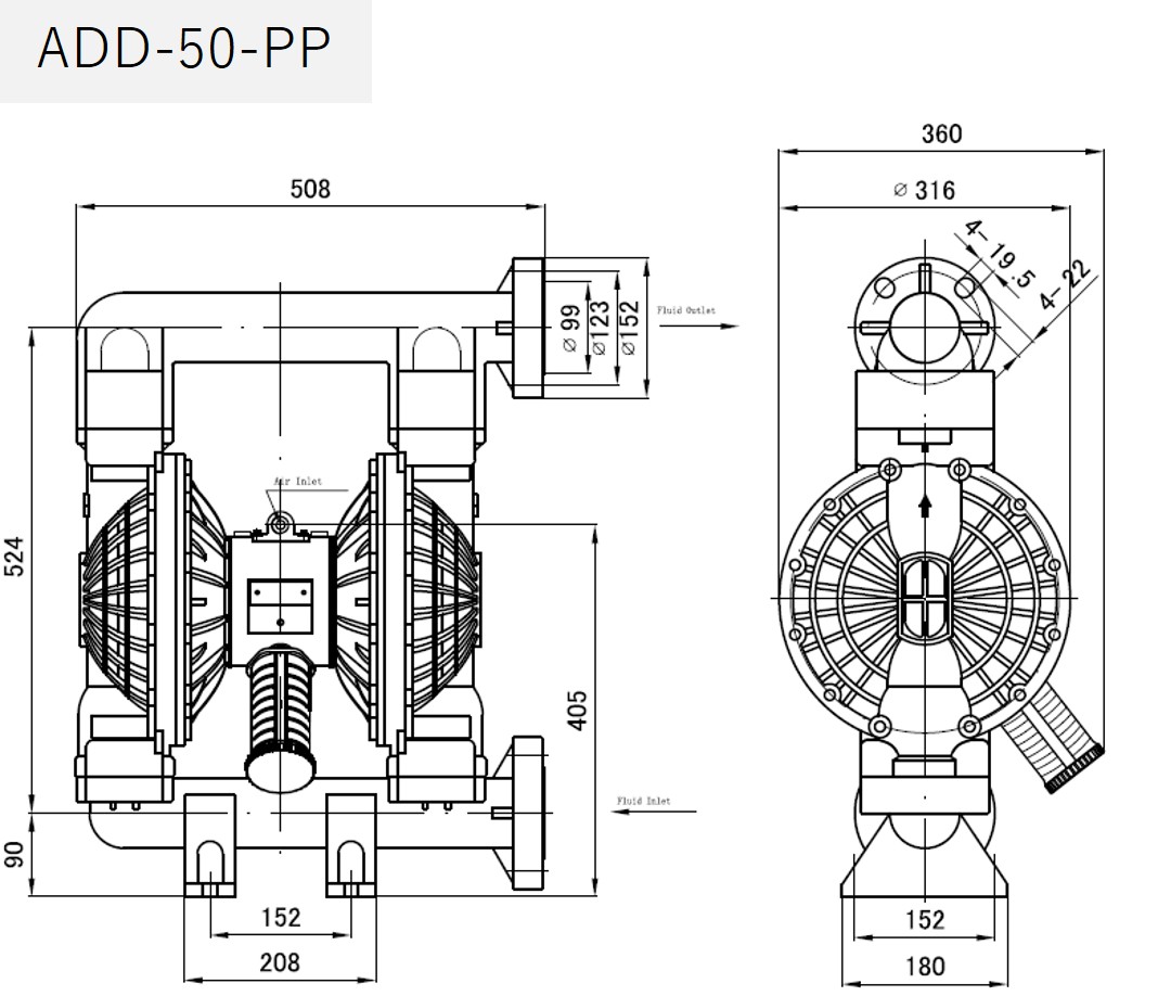 エアダイヤフラムポンプ ADDシリーズ外径寸法図